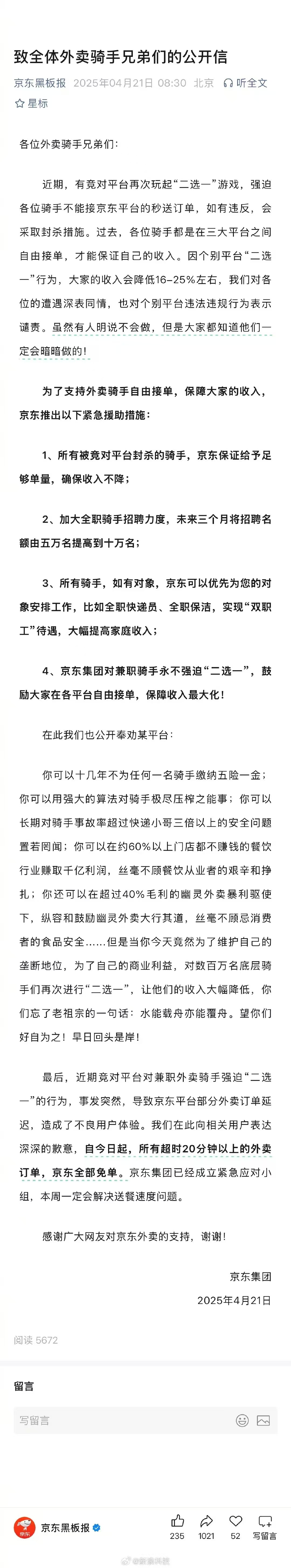 以下为京东《致全体外卖骑手兄弟们的公开信》全文: