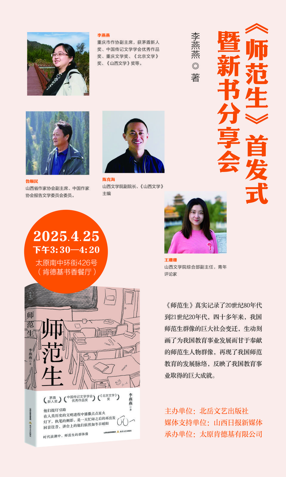 山西日报新媒体记者连成亮报道 4月25日下午3点半,由北岳文艺出版社主办的“《师范生》首发式暨新书分享会”将在肯德基(太原南中环国金店)举办。这也是山西日报社、山西出版传媒集团、太原肯德基有限公司联手打造的省内首家书香餐厅举办的第二期读者沙龙活动。