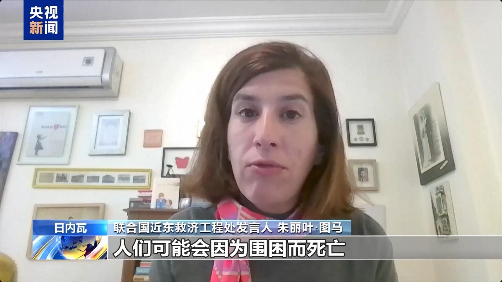联合国近东救济工程处发言人 朱丽叶·图马:由于缺乏食物,人们可能会因为围困而死亡,也会因为缺少医疗用品而死亡。想象一下,当地所有的商店都被迫关闭,因为没有补给,你无法给你的孩子任何东西,只能眼睁睁看着孩子在挨饿,这就是目前加沙的情况。