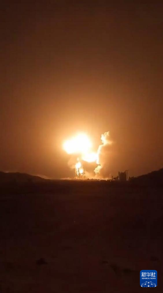 5月5日,在也门荷台达省东部巴吉勒区,一家水泥厂遭到空袭后燃起大火(视频截图)。新华社发