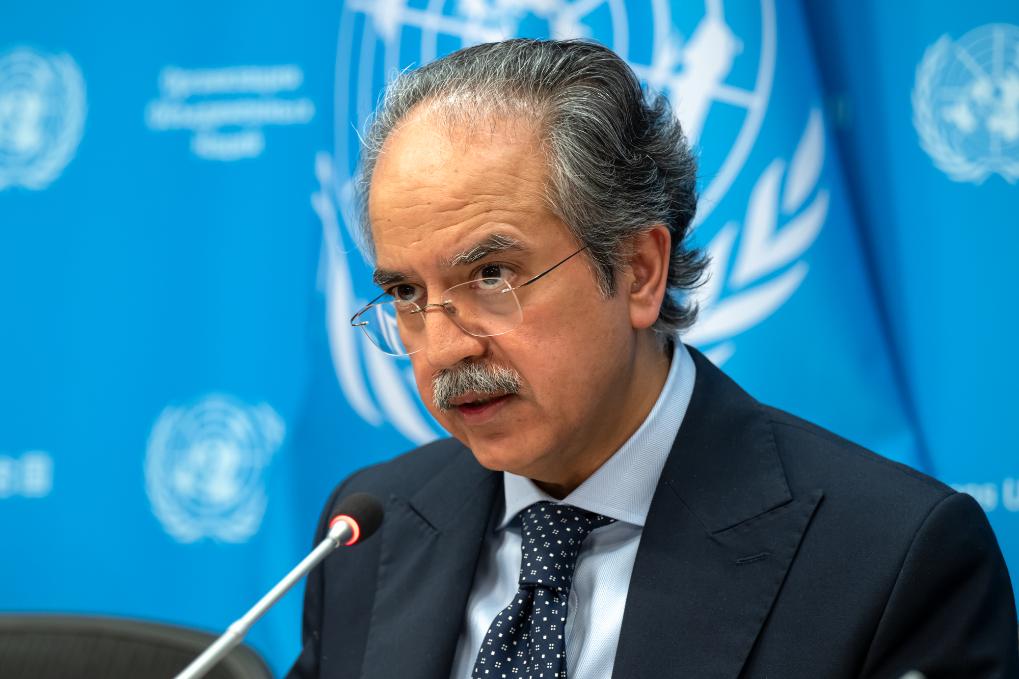 5月2日,在位于纽约的联合国总部,巴基斯坦常驻联合国代表阿西姆·伊夫蒂哈尔·艾哈迈德在新闻发布会上讲话。新华社发(联合国供图/马克·加滕摄)