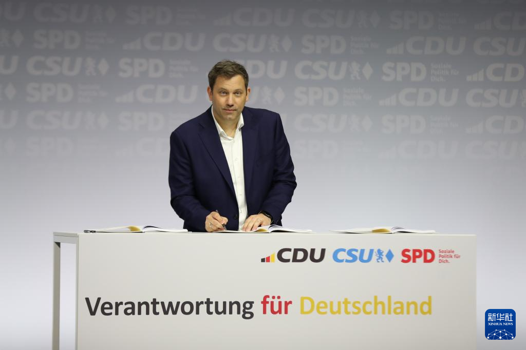 5月5日,在德国柏林,德国社民党联合领导人拉尔斯·克林拜尔签署联合执政协议。新华社记者 杜哲宇 摄