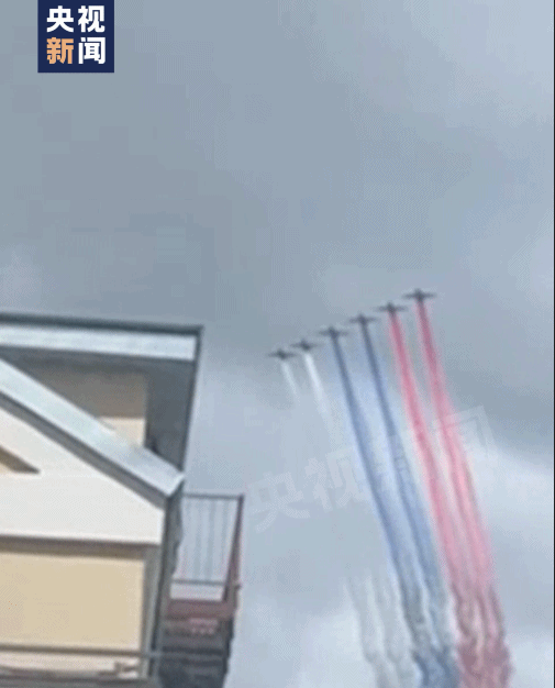 视频画面显示,多架军机飞越莫斯科上空,在蓝天中拉出俄罗斯国旗白蓝红三色彩烟。