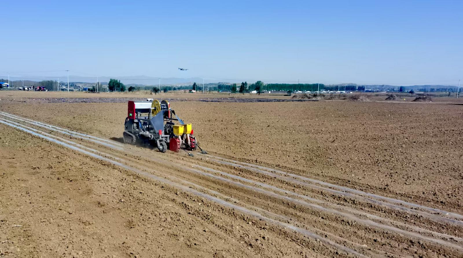 在地头展示的无人驾驶智能覆膜高粱播种机器人基于北斗导航,播种路线精准,能依据地形灵活变速,适用于丘陵、平川等多种地形地貌;具有集覆膜、铺滴灌带、播种、施肥于一体功能,依托北斗定位保证农作物株行距一致,与传统机械作业比较每次可省2至3人,作业效率提升超50%。