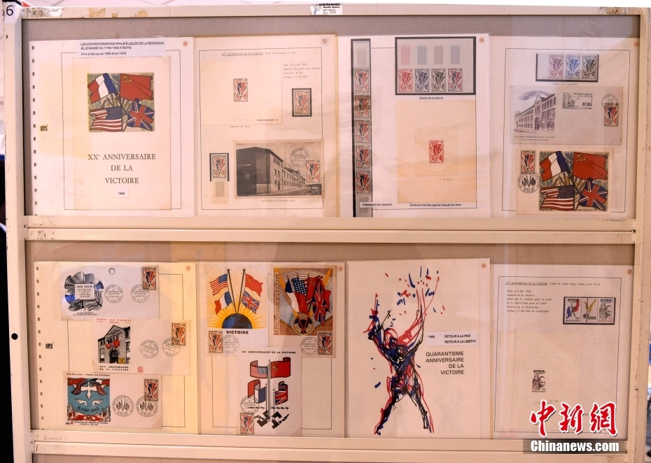 兰斯中央邮局为配合邮票发行举办的邮展,展示法国邮政为纪念二战胜利发行的相关邮票。