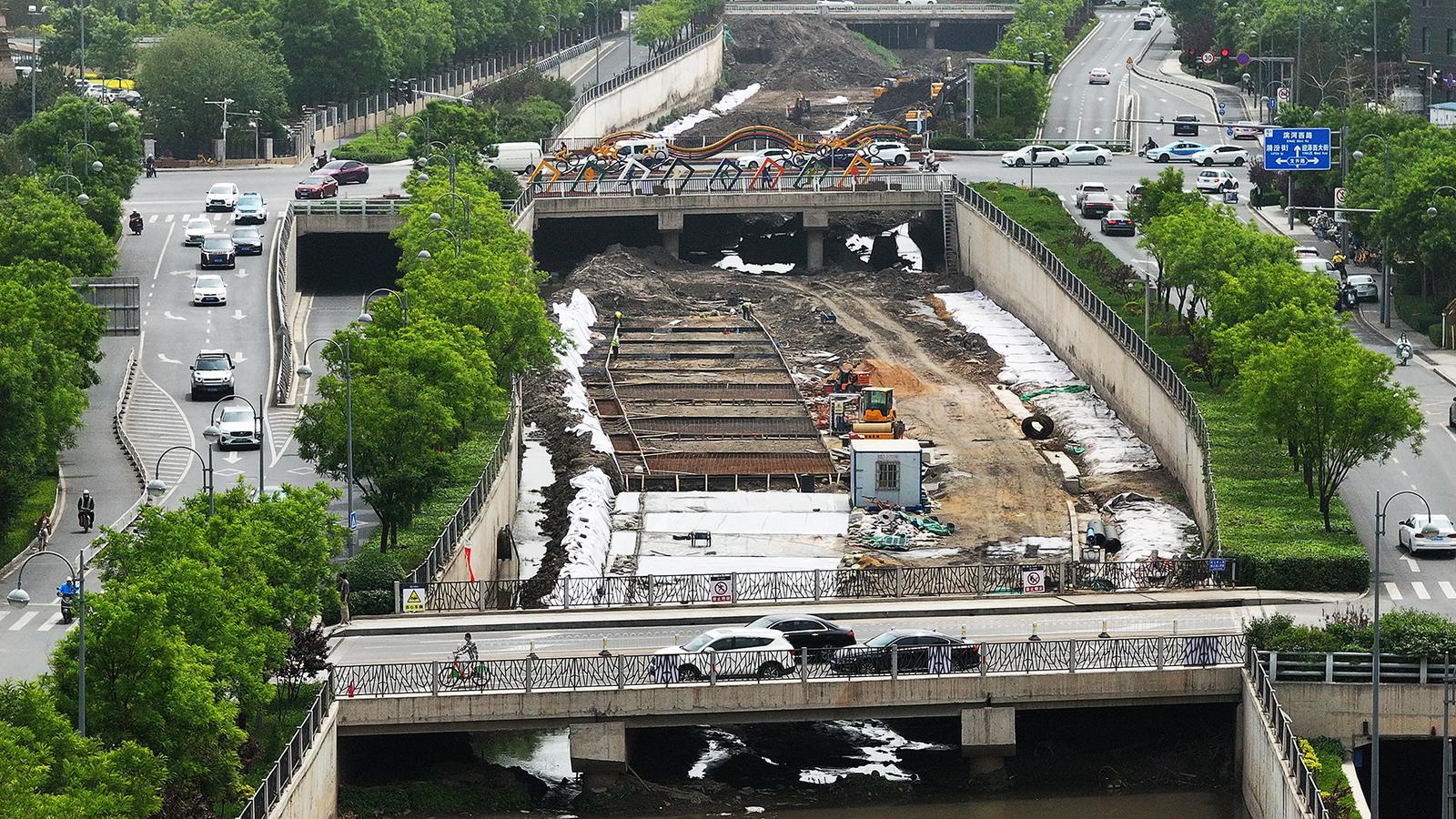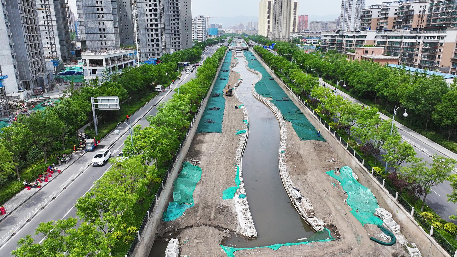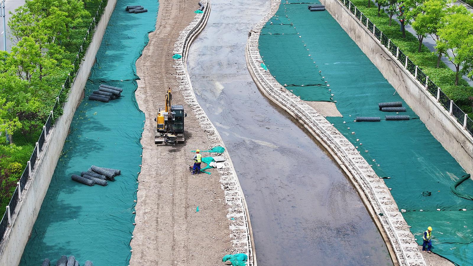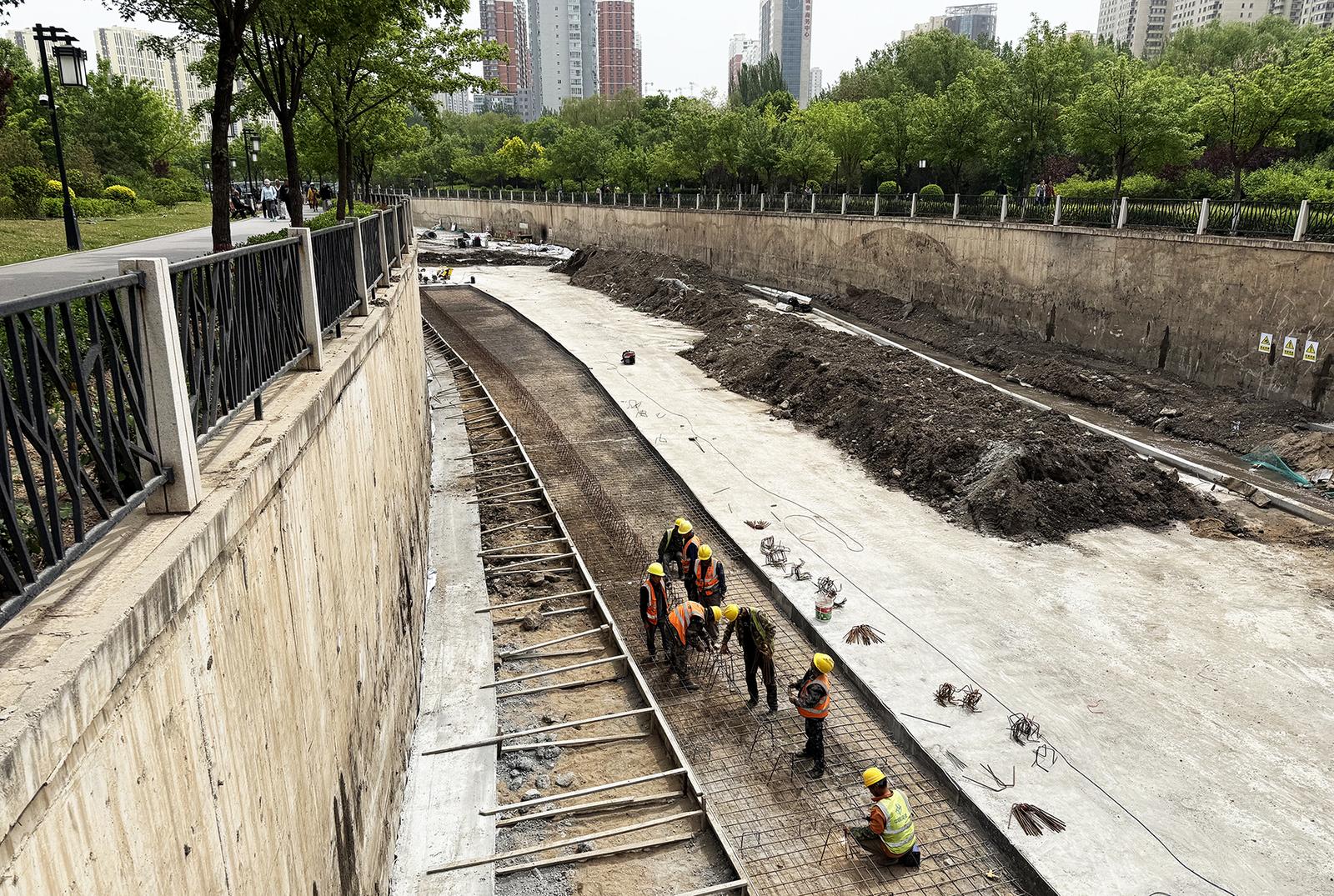 5月8日,太原市万柏林区,玉门河河道内工人正在进行硬化及附属设施安装。近日,太原市玉门河河道改造工程正在如火如荼进行中。该工程作为汾河段主要支流整治重点项目,西起小西铭村,东至入汾河口,治理长度达10.4千米 。目前,河道清表已完成10公里,主槽开挖9.5公里,硬化工作完成约70%,预计不久后全部完工。此次改造内容丰富,除河道拓宽、硬化,还包括沉砂地打造、下河坡道建设、钢坝围栏安装等,后续护坡也将进行绿化美化。
