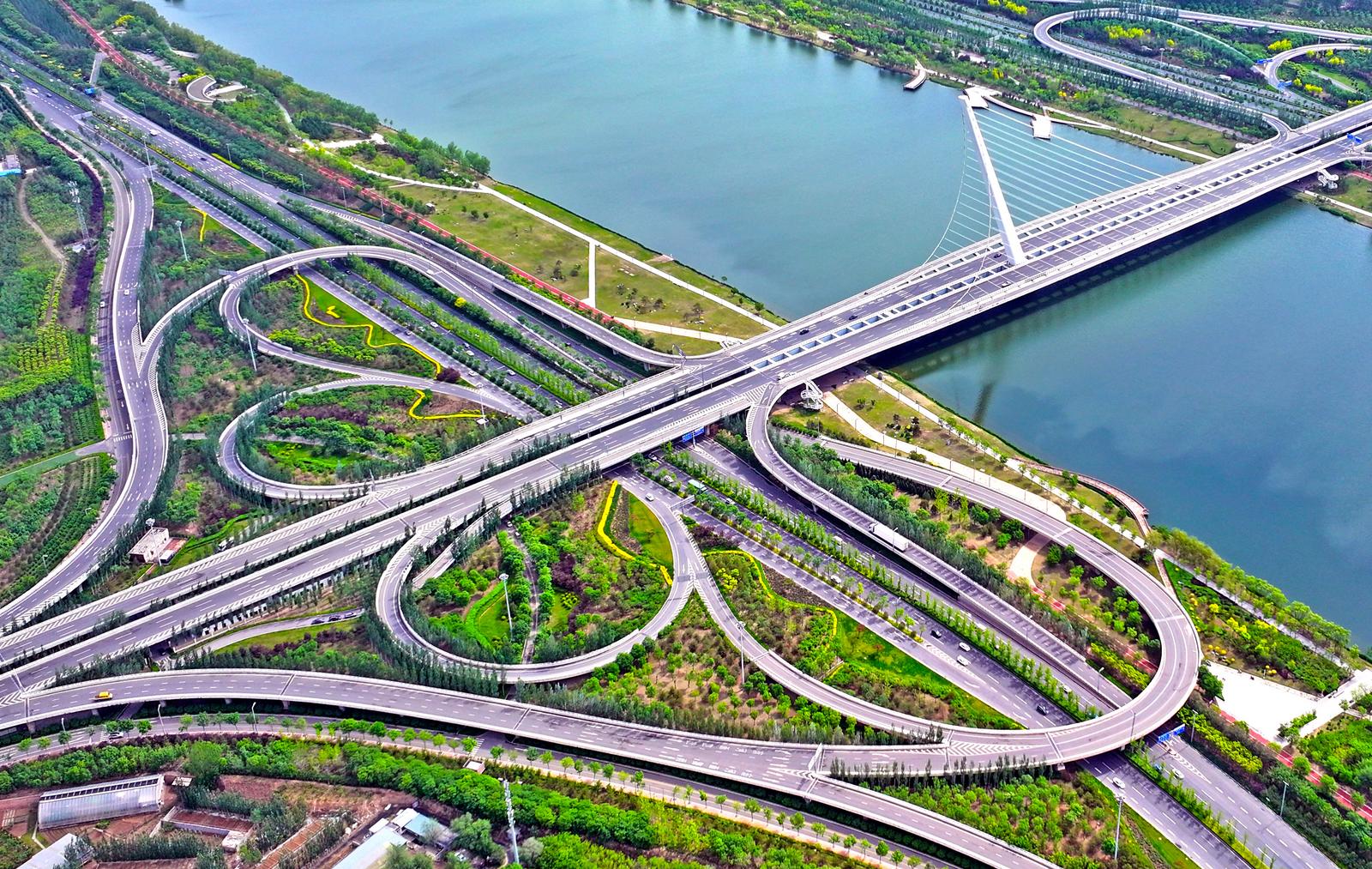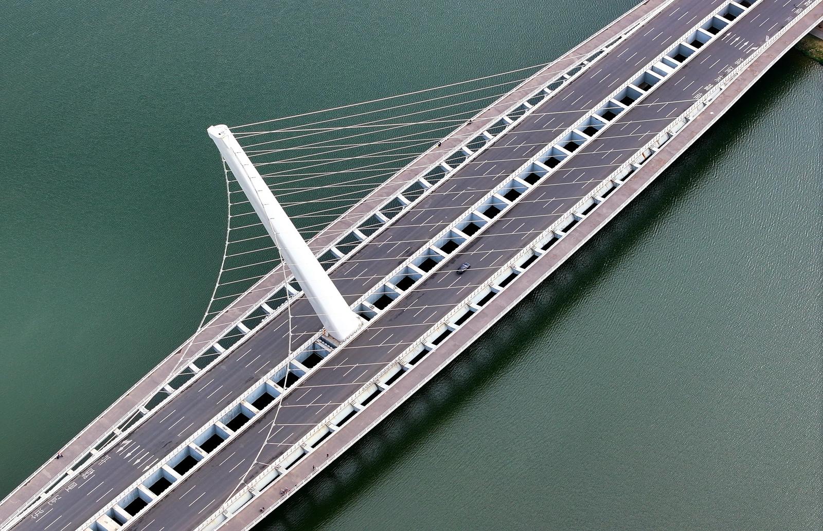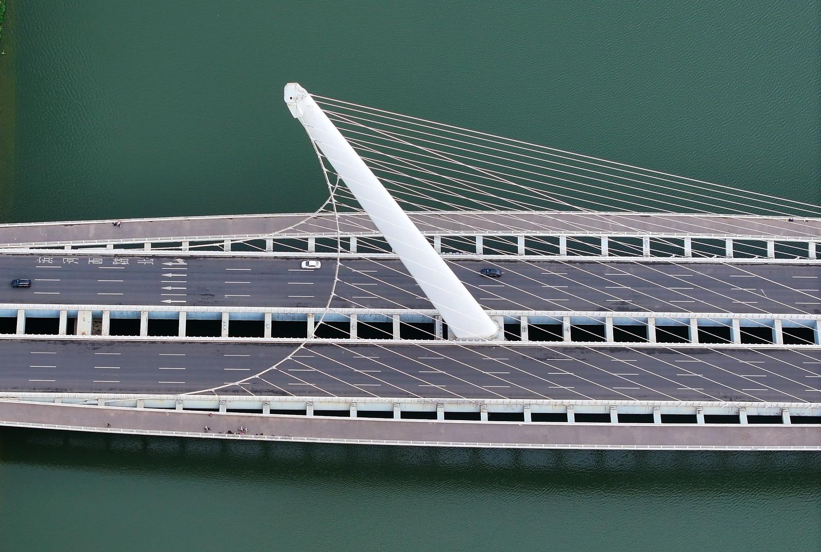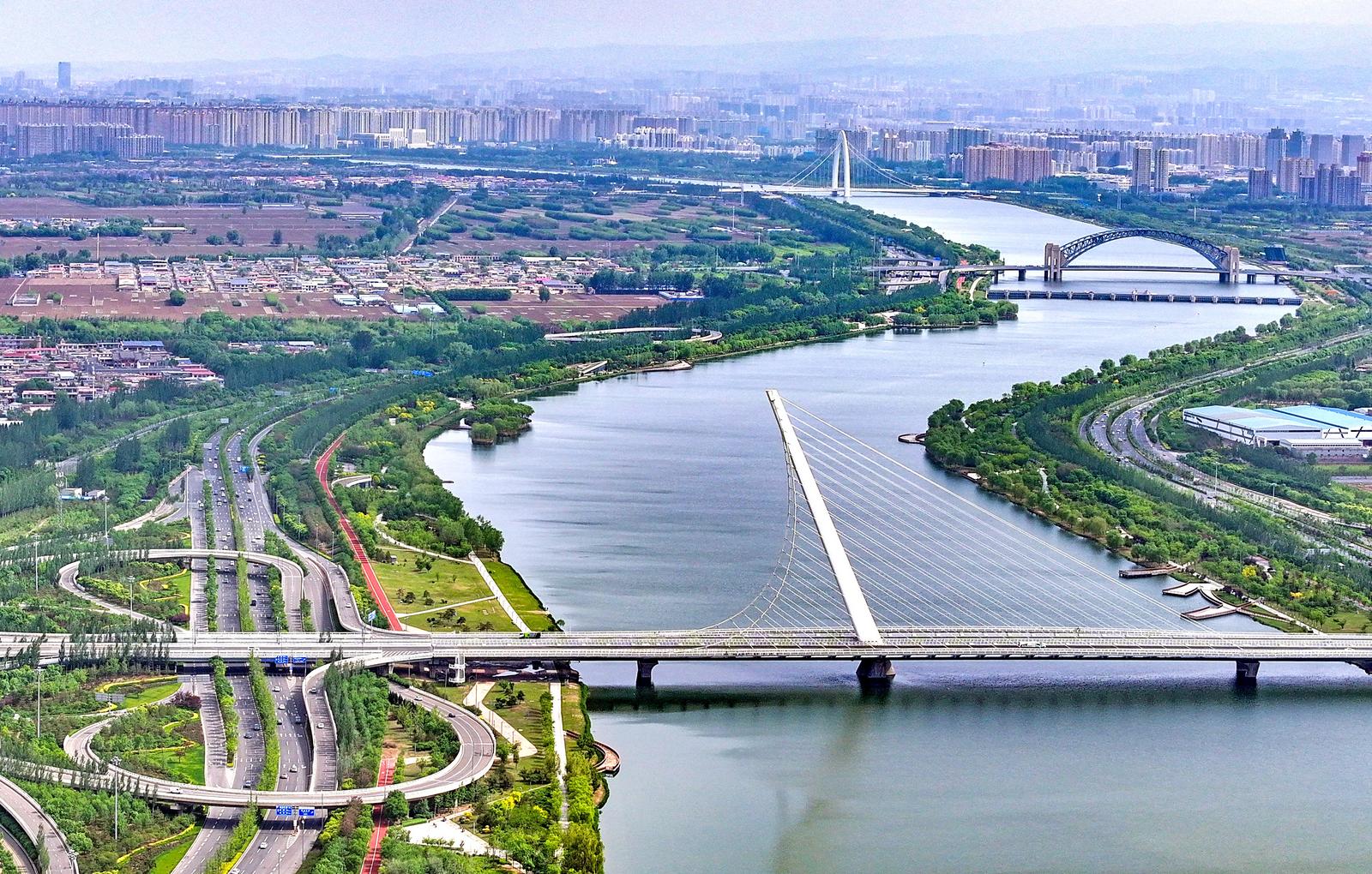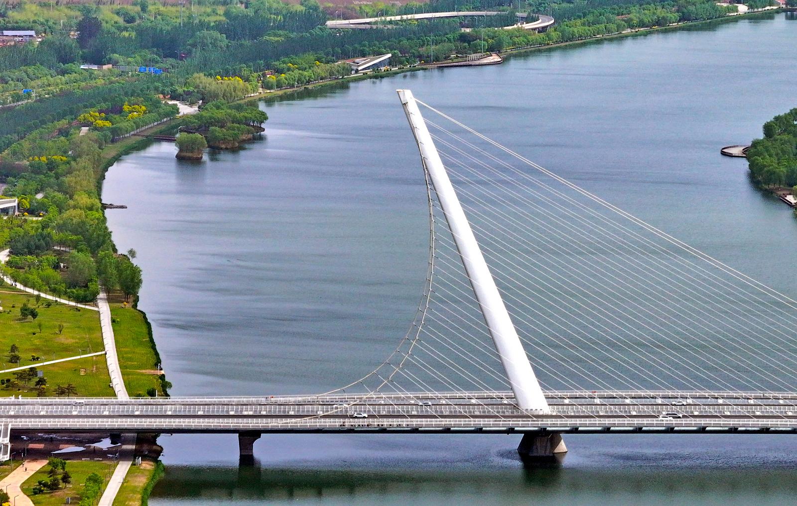 山西日报记者刘通摄影报道 5月9日,极具现代感与艺术气息的太原市汾河迎宾在阳光下彰显雄浑大气。迎宾桥造型独特,采用了单塔斜拉的设计结构,白色主塔高耸,线条简洁流畅,。它横跨汾河,不仅是交通要道,更成为城市一道亮丽风景线。