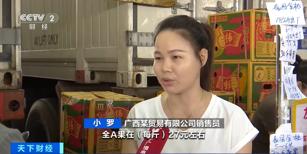 广西某贸易有限公司销售员 小罗:目前金枕榴莲的单价,全A果在每斤27元左右,有一些稍微次一点,批发价就大概在每斤20元到22元。