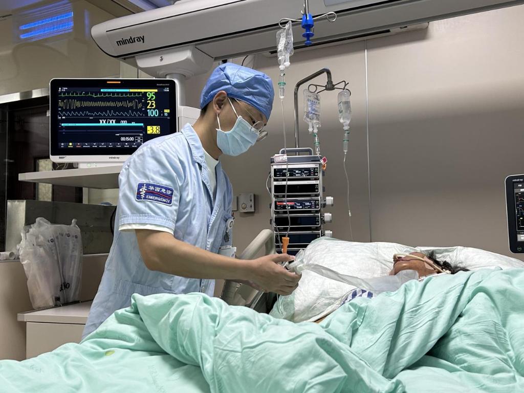 2025年5月9日,四川大学华西医院急诊科护士陈意正在护理病人。新华社记者 赵怡宁 摄