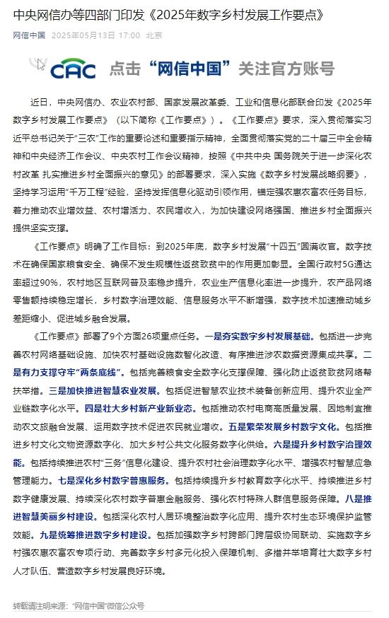 中央网信办等四部门印发《2025年数字乡村发展工作要点》