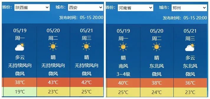 城市中,像西安、咸阳、渭南在5月没有出现过40℃,一旦出现都将是破纪录的。郑州19日最高气温或达40℃,是5月份少见的炎热。