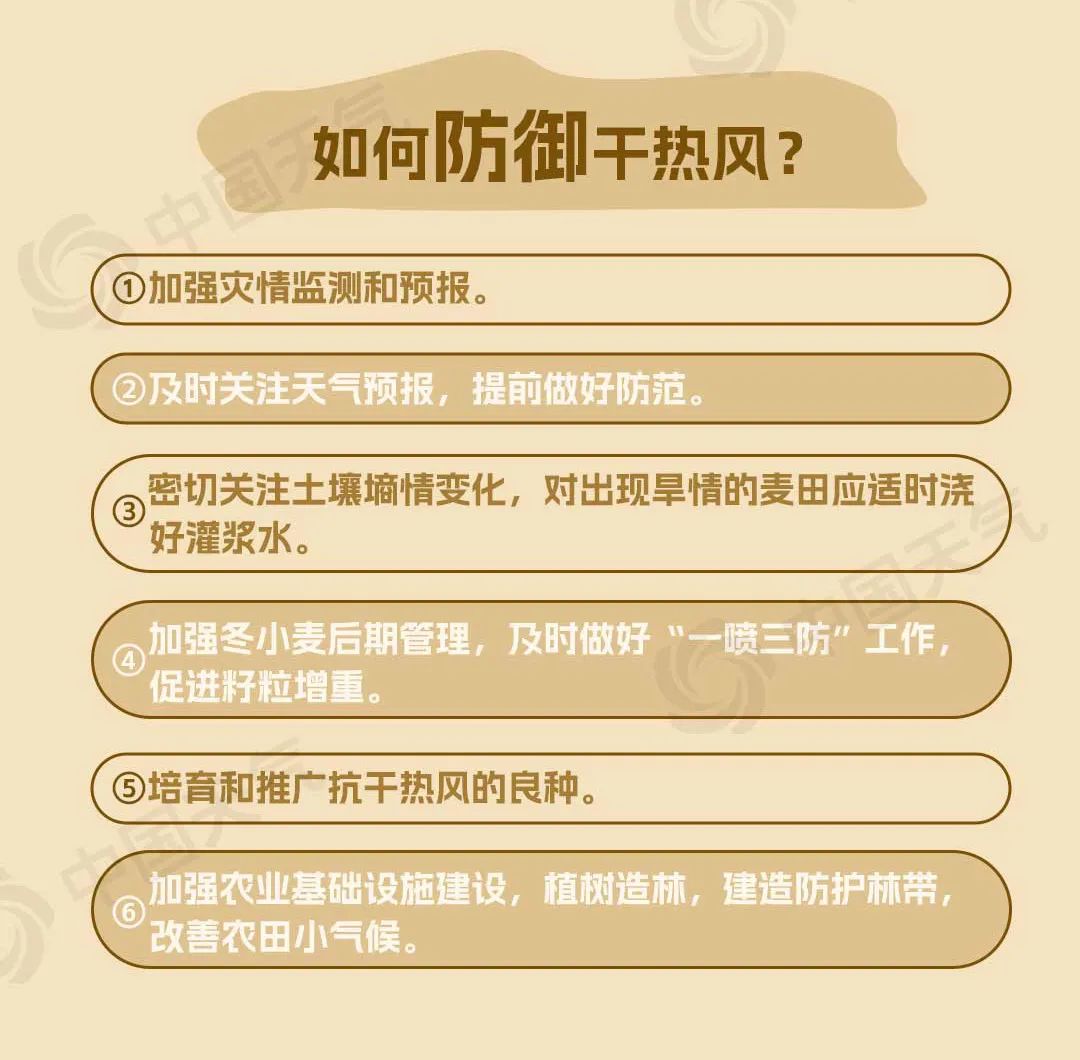 同时,陕西、河南等地冬小麦区将出现3天以上干热风天气,干热风将影响冬小麦灌浆,需提前做好“一喷三防”等预防措施。
