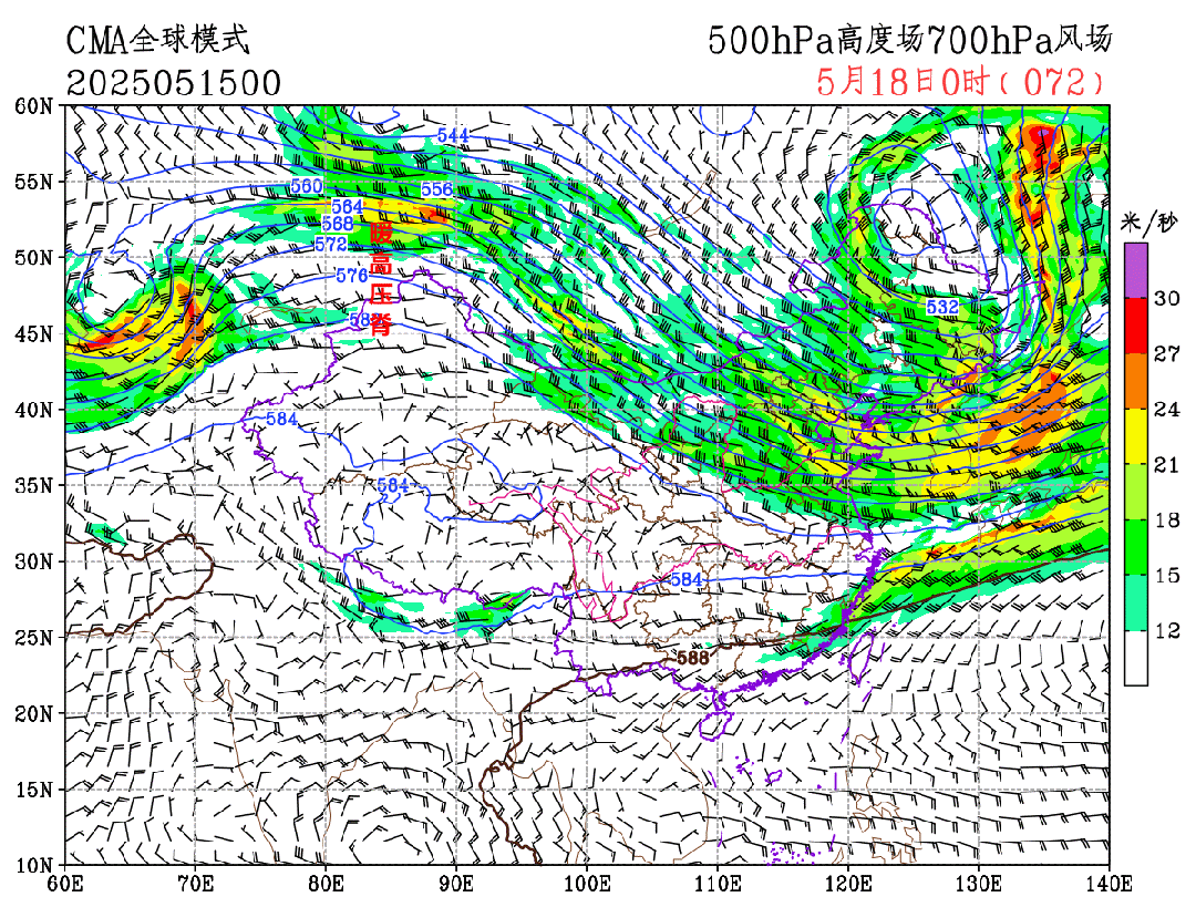 按照目前预报的形式来看,热是肯定的。常年来看,5月份我国接收光照加热最明显的地区就是陕西、河南一带。这次新疆一带还有一个大型的暖高压脊,陕西、河南正处于脊前西北气流里,以晴天为主、低空干燥,同时这个暖高压脊还会把新疆一带的干热空气向陕西、河南输送,因此这一带地区高温尤其突出。