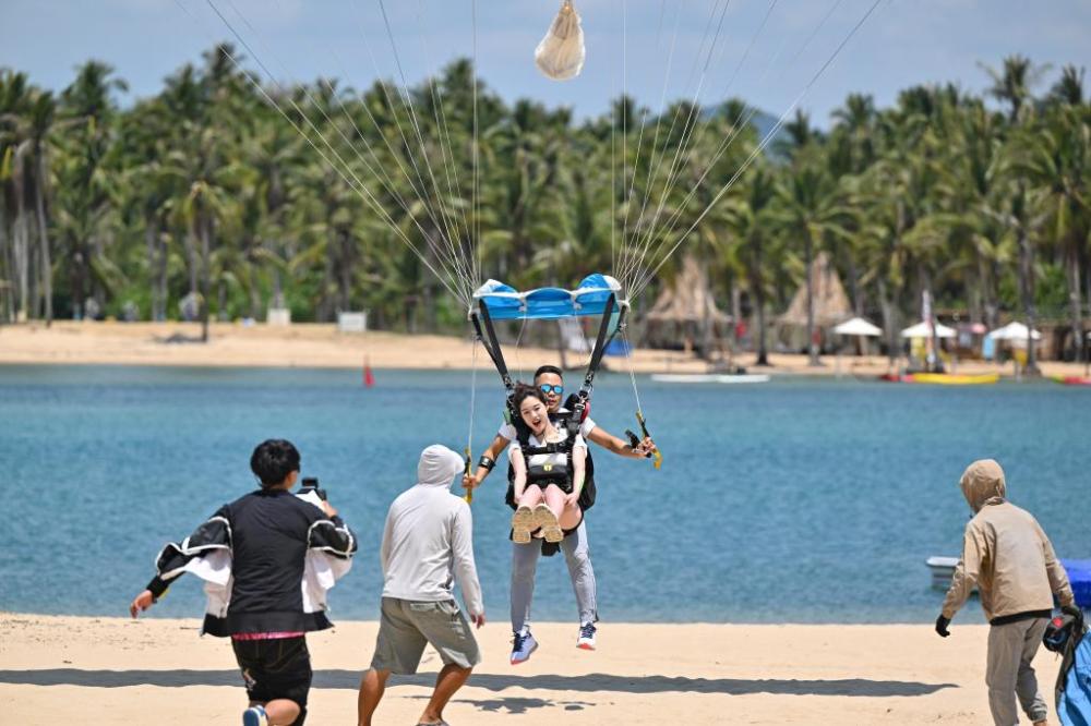 5月2日,游客在三亚塔赫跳伞基地体验跳伞。新华社记者 郭程摄
