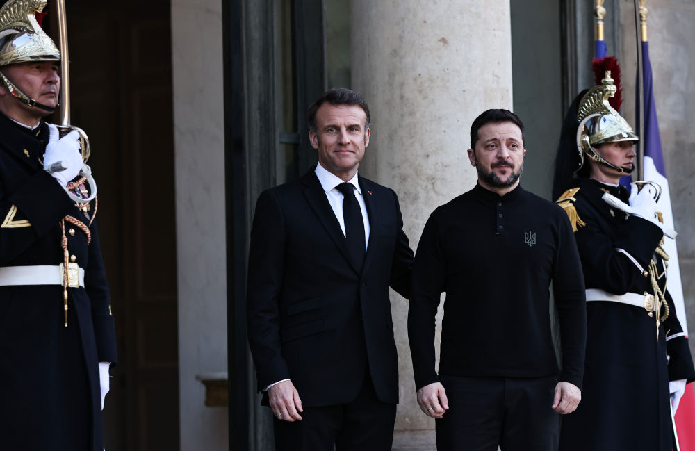 2025年3月26日,法国总统马克龙(中左)在巴黎总统府爱丽舍宫迎接到访的乌克兰总统泽连斯基。新华社记者高静摄