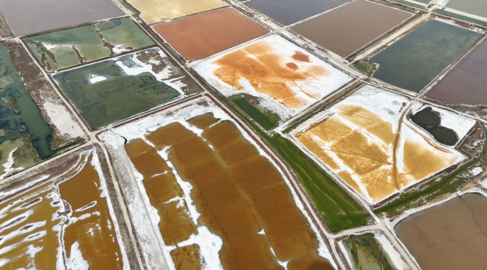 连日来,随着气温持续升高,位于山西南部的运城盐湖呈现出色彩斑斓的景象,从空中俯瞰,如同一块块散落在大地上的调色盘。