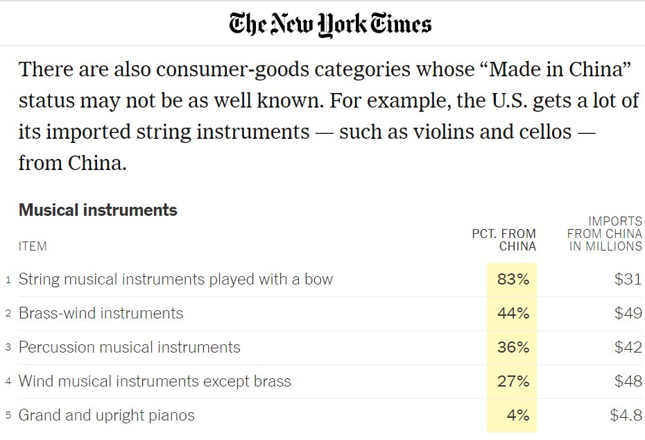 文章说,从清单中可以看出,美国从中国进口的主要商品都是消费品,覆盖生活中的多个场景:你衣橱中的领带、手套和连裤袜几乎都是从中国进口的;如果你是一名运动员,尤其是球类运动的运动员,那么你用的羽毛球、乒乓球、网球、健身房设备、泳池设备等都非常依赖“中国制造”;还有一些消费品类别的“中国制造”可能不那么广为人知。例如,美国从中国进口了大量弦乐器,包括小提琴和大提琴。维生素及其衍生物也大量从中国进口,还有各种冷冻鱼类,包括鳗鱼、鳕鱼、罗非鱼等等。