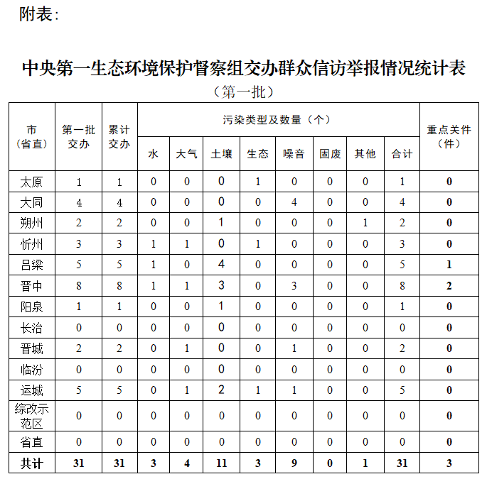中央第一生态环境保护督察组交办群众信访举报情况统计表(第一批)