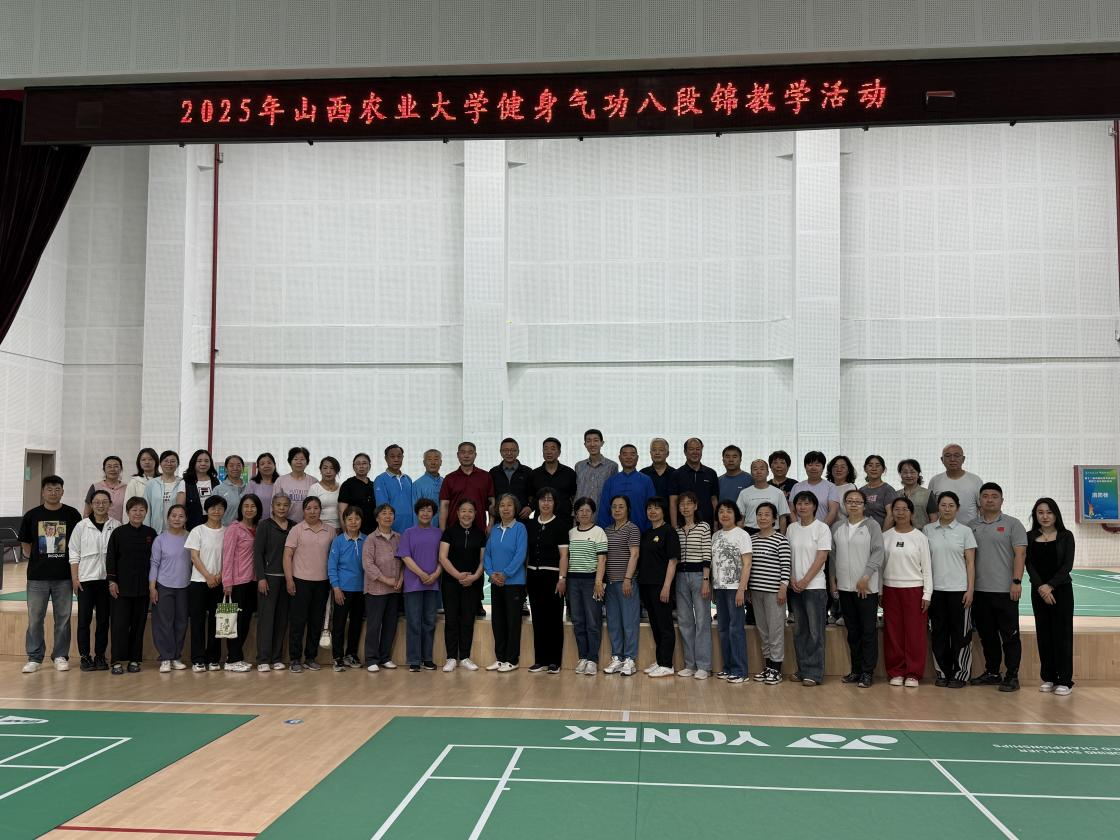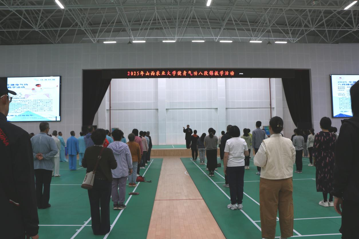 为弘扬中华优秀传统文化,推动全民健身活动在高校深入开展,丰富校园体育文化生活,从5月26日开始,一场以“健身气功赋能师生健康,体育运动助力健康中国”为主题的健身气功·八段锦教学活动在山西农业大学睿智文体馆拉开帷幕。本次活动得到了国家体育总局健身气功管理中心的大力支持,中心派出了教学经验丰富的汤铁军老师授课,还派出了该中心办公室副主任张德明全程指导。
