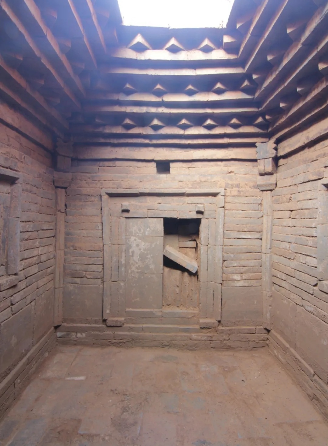 该墓室为砖砌单室墓,墓葬由墓道、墓门、甬道和墓室组成,墓底以条砖铺地,设棺床,棺床高0.15米。墓室四壁皆由条砖垒砌,壁面近墓底处以方砖砌成墙围,方砖间隔一竖立条砖,以示分栏。