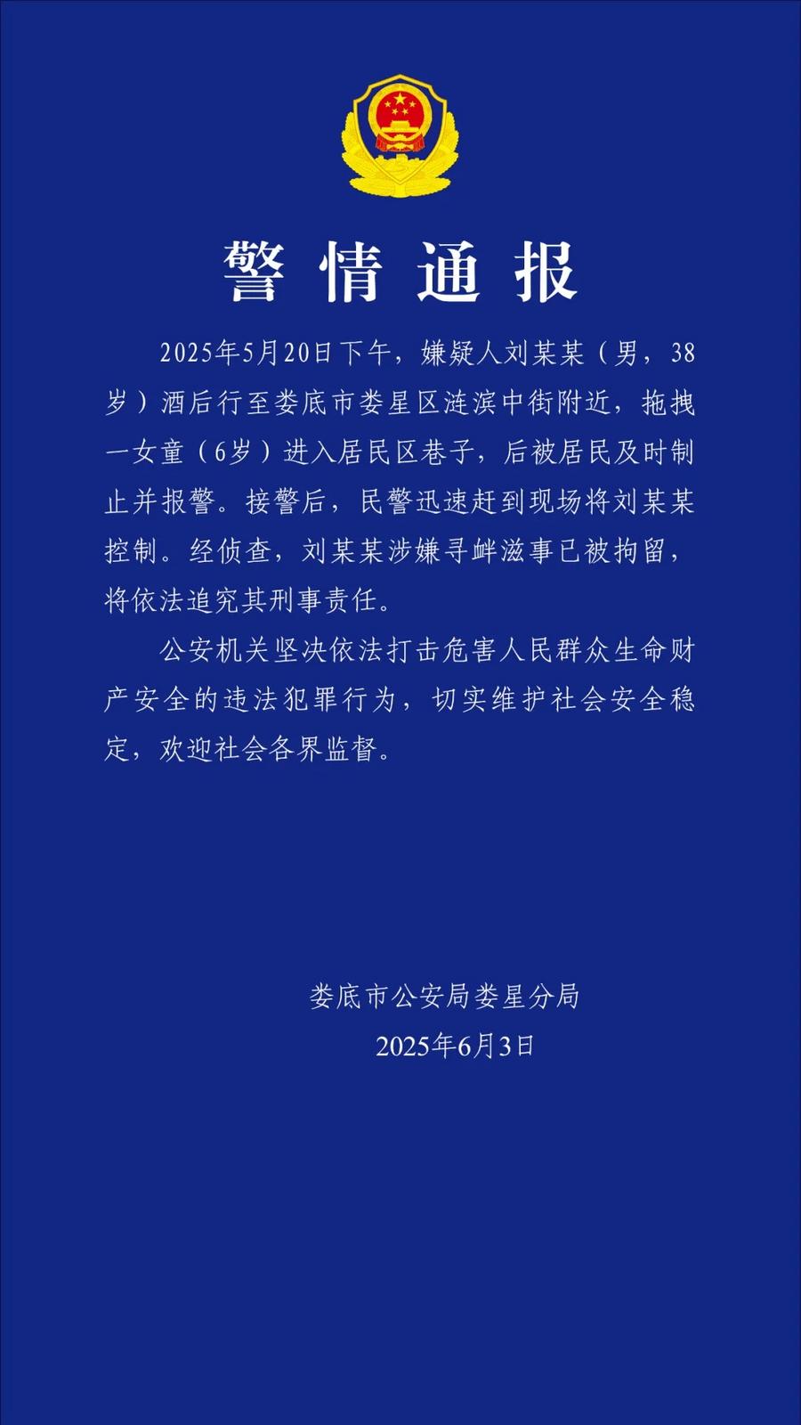 2025年5月20日下午,嫌疑人刘某某(男,38岁)酒后行至娄底市娄星区涟滨中街附近,拖拽一女童(6岁)进入居民区巷子,后被居民及时制止并报警。接警后,民警迅速赶到现场将刘某某控制。经侦查,刘某某涉嫌寻衅滋事已被拘留,将依法追究其刑事责任。