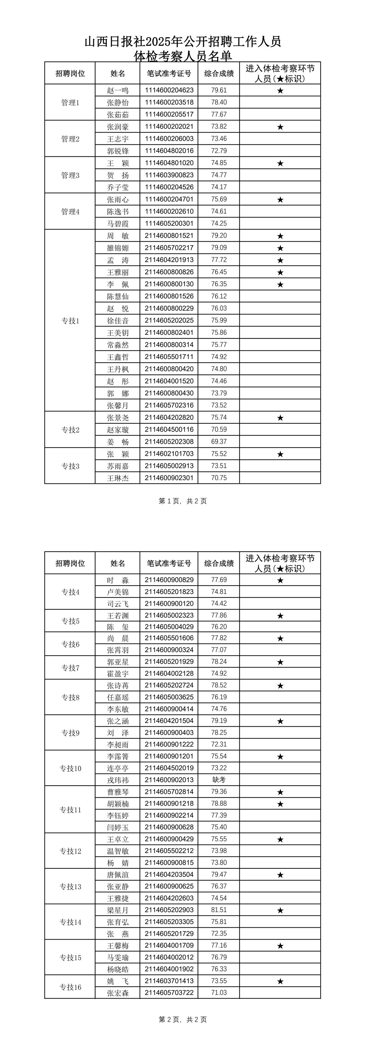 附件:山西日报社2025年公开招聘工作人员体检考察人员名单