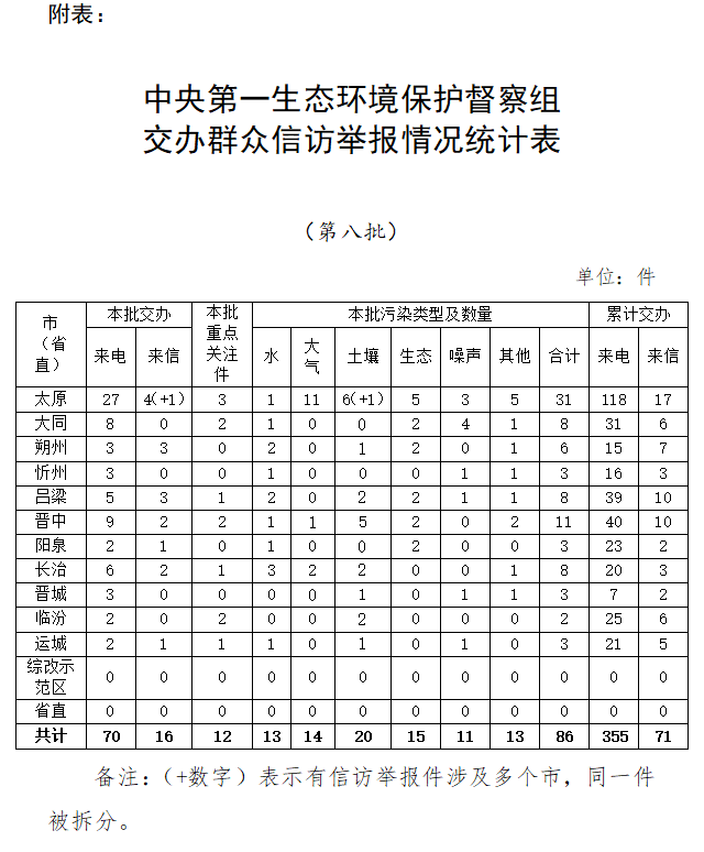 6月5日,中央第一生态环境保护督察组向我省交办的第八批信访举报件共86件,其中来电70件、来信16件;交办信访举报件中重点关注件12件,其中太原市3件、临汾市2件、大同市2件、晋中市2件、吕梁市1件、运城市1件、长治市1件。