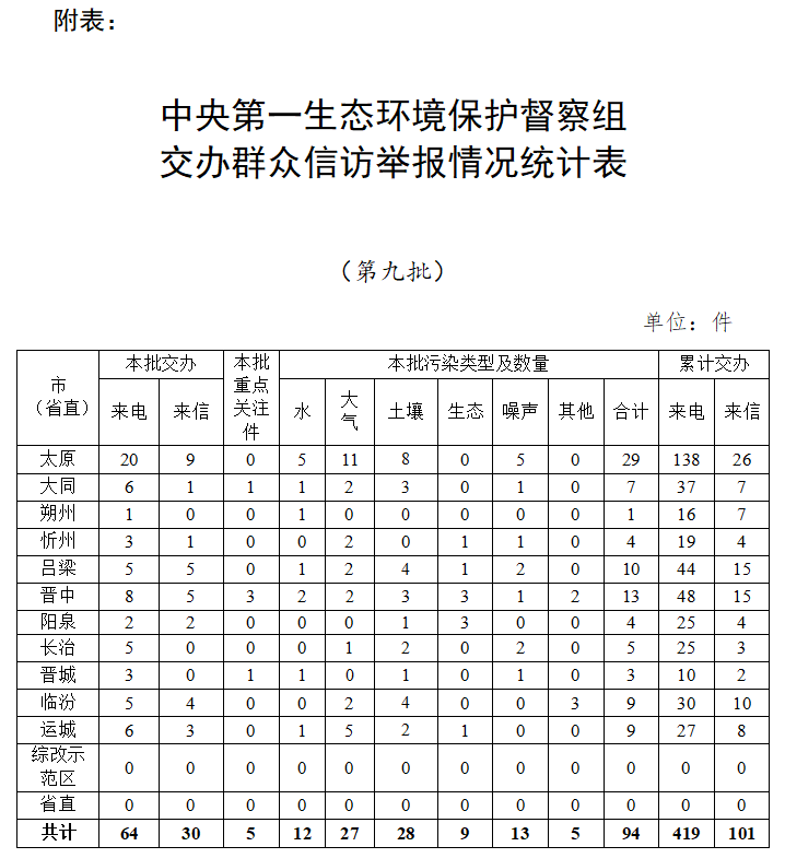 中央第一生态环境保护督察组交办群众信访举报情况统计表(第九批)
