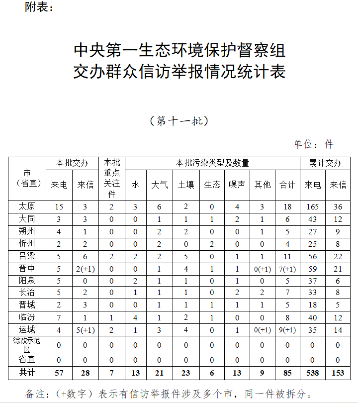 中央第一生态环境保护督察组交办群众信访举报情况统计表(第十一批)
