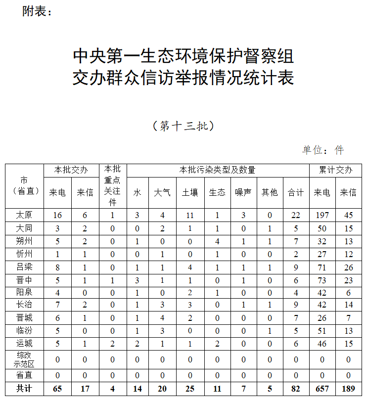 中央第一生态环境保护督察组交办群众信访举报情况统计表(第十三批)