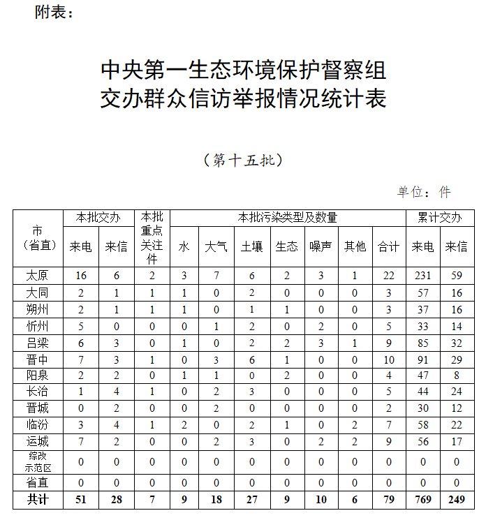 中央第一生态环境保护督察组交办群众信访举报情况统计表(第十五批)