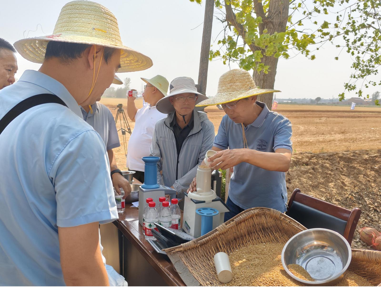 现场实打验收由国家小麦产业技术体系岗位专家、西北农林科技大学胡小平教授担任组长。来自甘肃农业大学、山西省农技推广服务中心、山西省种业发展中心、山西农业大学(省农科院)小麦研究所、运城市农技推广站的9位专家在听取项目组负责人对该项目开展情况报告的基础上,根据农业农村部《全国粮食高产创建测产验收办法(实行)》,在示范田随机用联合收割机收获7.52亩的连片田块,实收籽粒鲜重5422公斤,折算标准含水量后,最终平均亩产765.76公斤。