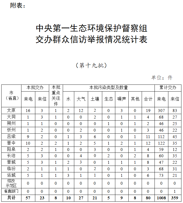 中央第一生态环境保护督察组交办群众信访举报情况统计表(第十九批)