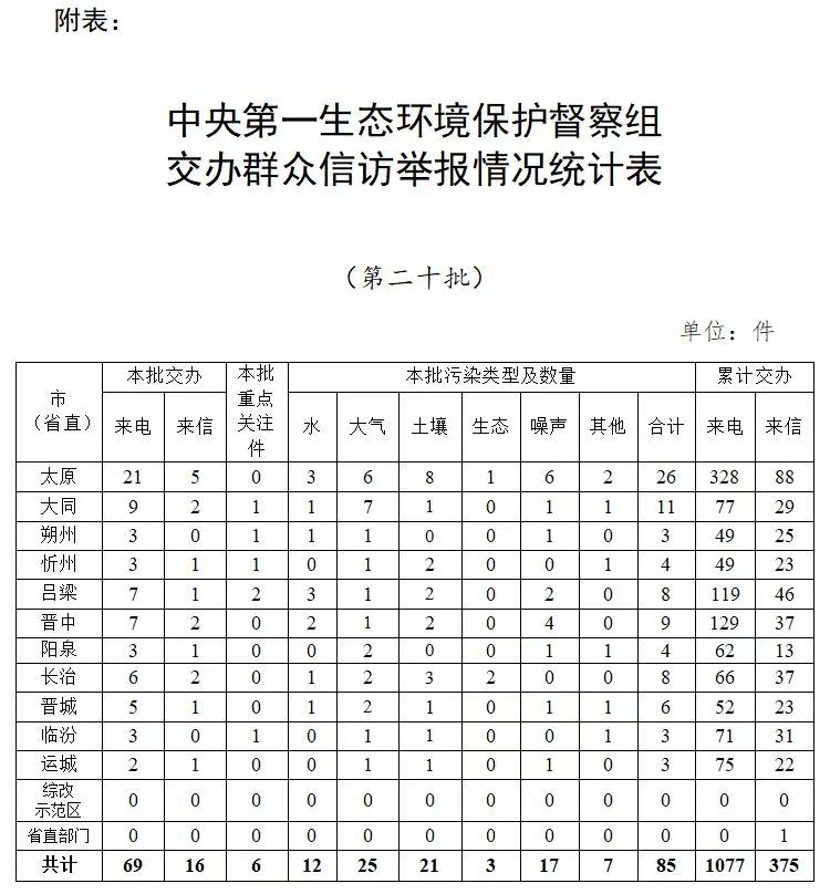 6月17日,中央第一生态环境保护督察组向我省交办的第二十批信访举报件共85件,其中来电69件、来信16件;交办信访举报件中重点关注件6件,其中吕梁市2件、大同市1件、朔州市1件、忻州市1件、临汾市1件。