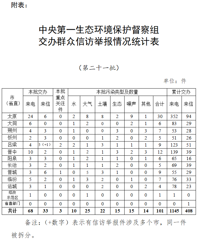 中央第一生态环境保护督察组交办群众信访举报情况统计表(第二十一批)