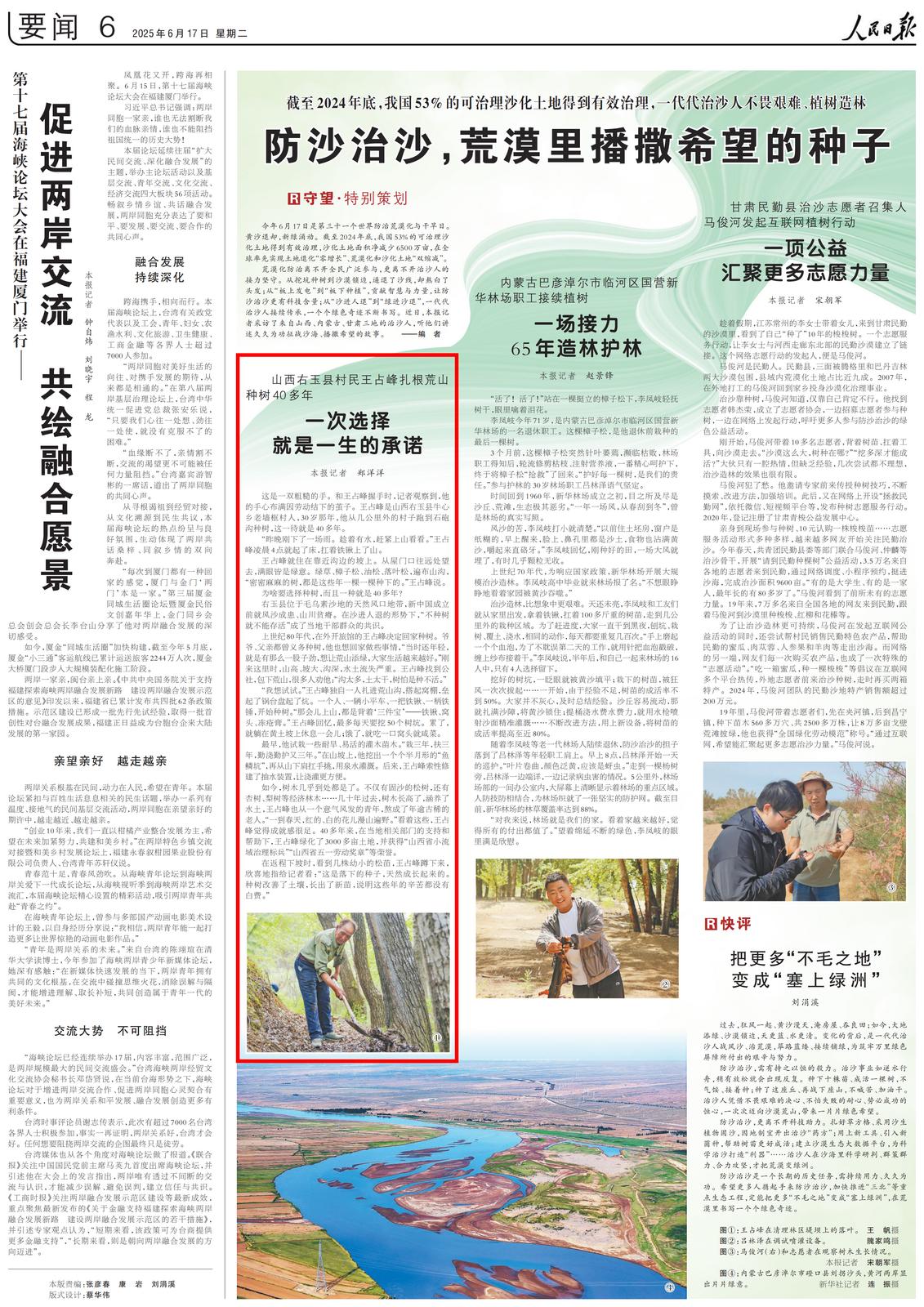 荒漠化防治离不开全民广泛参与,更离不开治沙人的接力坚守。从挖坑种树到沙漠锁边,逼退了沙线,却熬白了头发;从“板上发电”到“板下种植”, 贡献智慧与力量,让防沙治沙更有科技含量;从“沙进人退”到“绿进沙退”,一代代治沙人接续传承,一个个绿色奇迹不断书写。近日,记者采访了来自山西、内蒙古、甘肃三地的治沙人,听他们讲述久久为功征战沙海、播撒希望的故事。