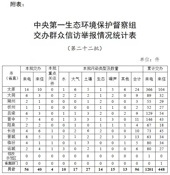 6月19日,中央第一生态环境保护督察组向我省交办的第二十二批信访举报件共96件,其中来电56件、来信40件;交办信访举报件中重点关注件4件,其中长治市1件、晋城市1件、临汾市1件、运城市1件。