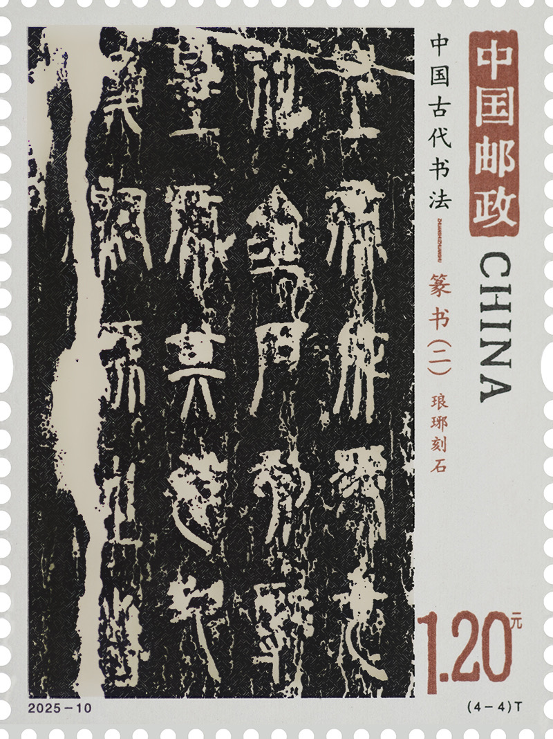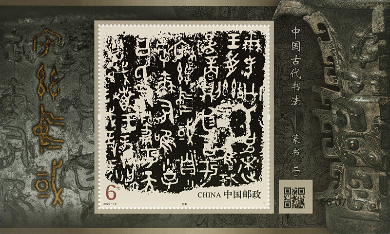 这套邮票通过其青铜铭文与石刻文字拓片,传递千年篆韵。大盂鼎因作器者为西周康王之臣盂而得名,以其浑厚庄重的金文位列首枚,笔画丰腴挺拔,堪称西周早期金文书法艺术的杰出代表;中山王舋 外壁刻满了77行铭文,共计469个字,是目前发现的铭文最长的战国青铜器,铭文展现绮丽飘逸的装饰趣味,是先秦古文字精品奇珍;石鼓是形似圆鼓的一组花岗岩刻石,秦人曾在十面鼓形巨石上刻下十首四言诗,记述君主的游猎盛景,吾车为其中一面,石鼓文作为石刻之祖,记录了大篆向小篆过渡的笔意;琅琊刻石则留存李斯小篆的典范,是中国最早的刻石之一,是秦朝统一全国文字的典范之作,虽仅存秦二世诏书部分,仍可窥见“书同文”的历史印记;何尊其“宅兹中国”铭文不仅是“中国”一词最早实物与文献见证,也成为中国邮政标志的设计灵感来源。
