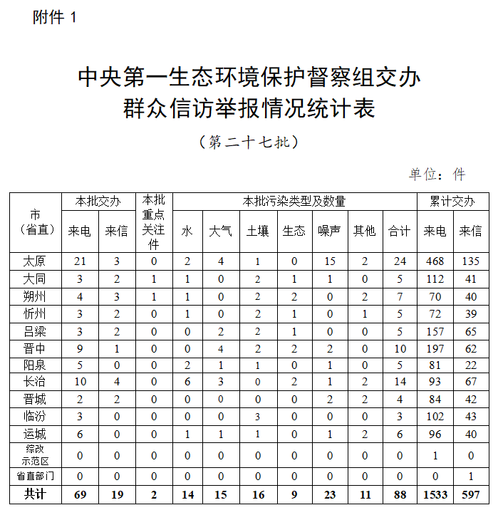 中央第一生态环境保护督察组交办群众信访举报情况统计表(第二十七批)