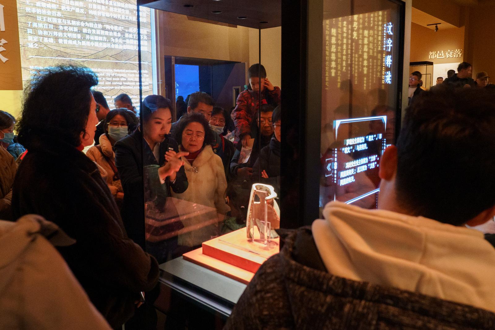 陶寺遗址博物馆内,讲解员为游客介绍文尧陶扁壶