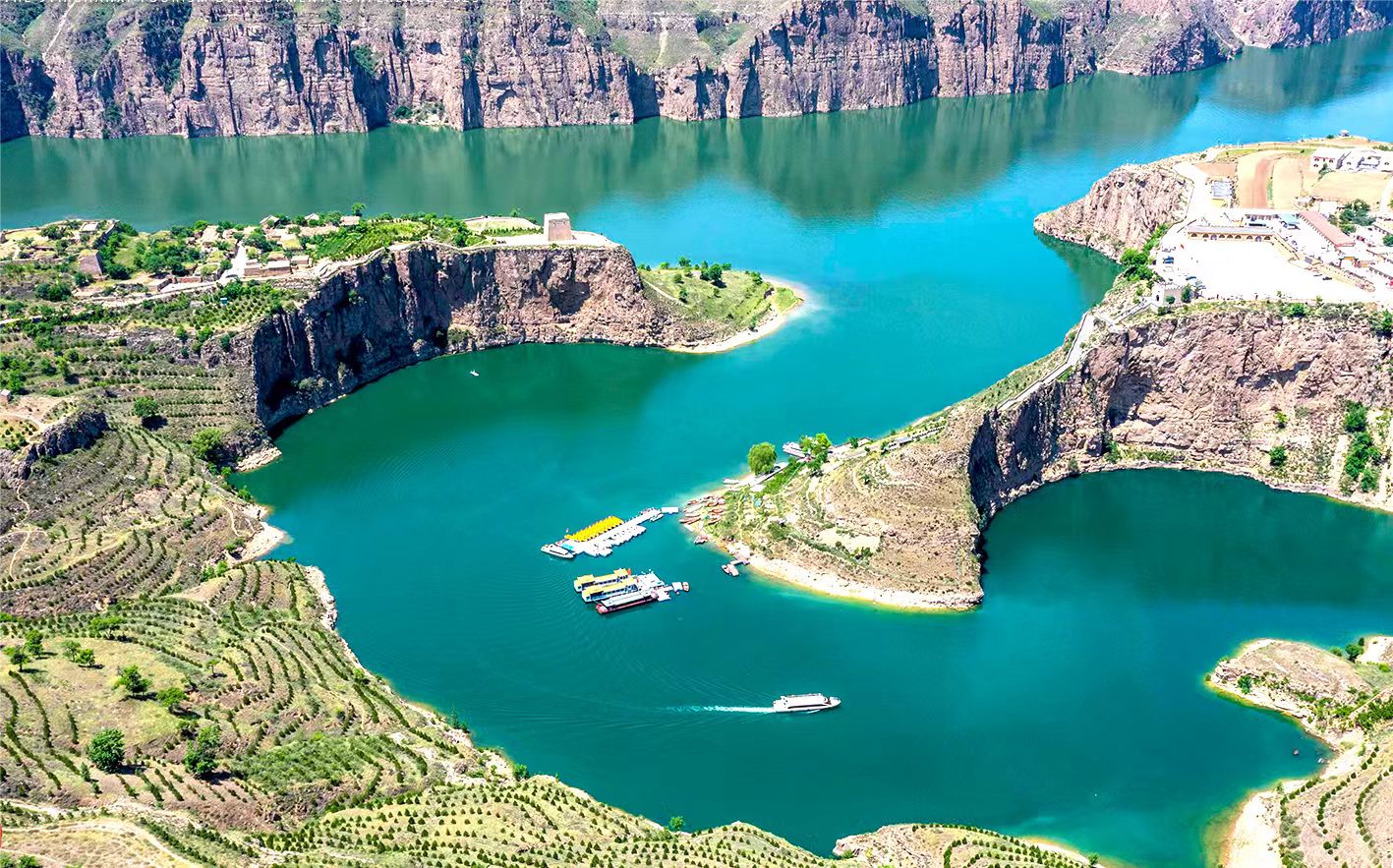 7月8日,记者驱车沿黄河一号旅游公路行驶在大山河谷之间。过偏关县城约40余公里,被评为“中国最美十大峡谷”之一的老牛湾豁然映入眼帘。站在乾坤湾畔极目远眺,黄河曲折蜿蜒的形态,仿佛一个巨大的“S”形,而从高空俯瞰,它又宛如一张生动的“太极图”。游船轻轻划过河面,波光粼粼,宛如一幅流动的画卷。