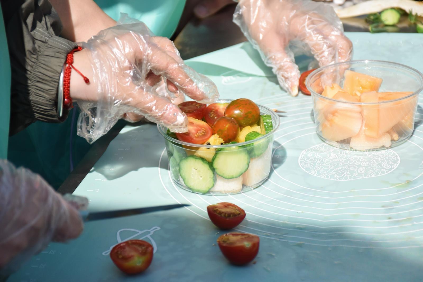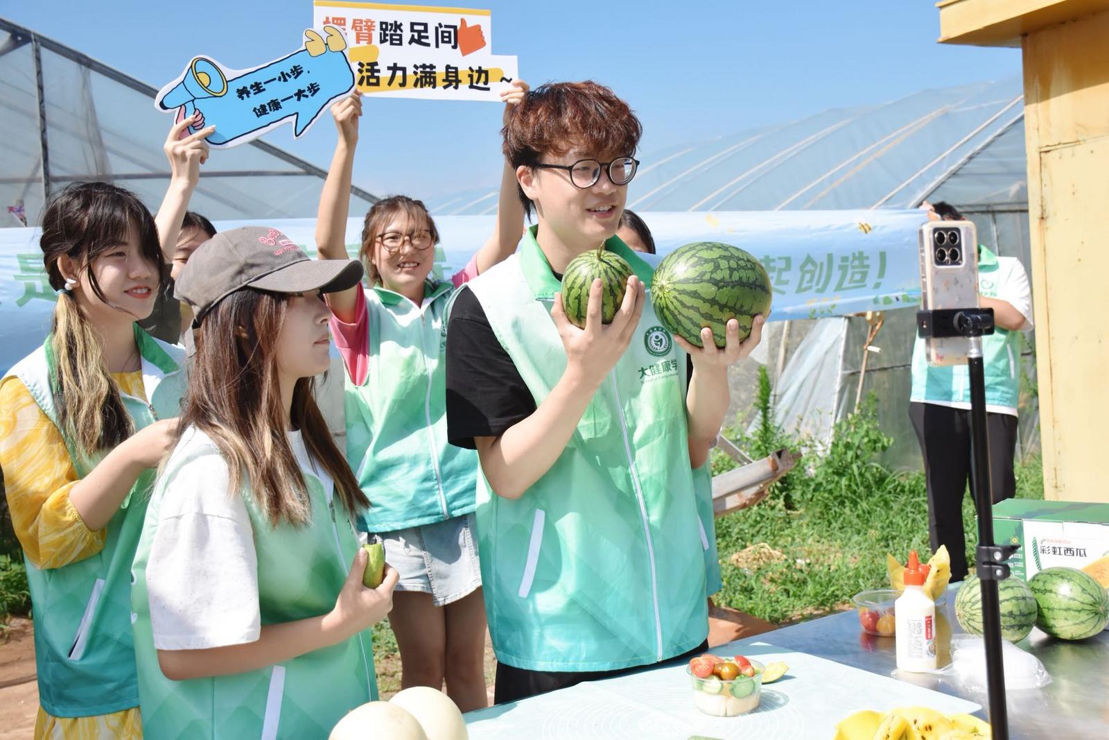 此外,团队还在农场开展了“健康科普课堂”。他们选用农场新鲜采摘的西红柿、香瓜、彩虹西瓜等食材,现场进行精细化处理与营养沙拉制作,并同步讲解各类食材的营养成分与健康价值,使科普知识在实操中有效传递。制作完成的蔬菜沙拉兼具美感与营养,直观展现了农场食材的优质特性。活动尾声,团队通过线上直播,将子平农场的健康理念、生产模式与优质农产品进行推广,实现了田间健康密码向“云端科普”的有效转化。