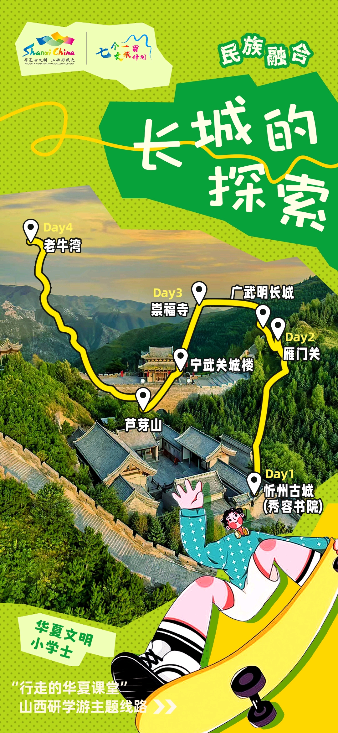 线路一“长城的探索”:忻州古城——秀容书院——长城关隘和古城楼——雁门关——漫步广武古城——崇福寺——宁武关遗址——芦芽山景区——老牛湾