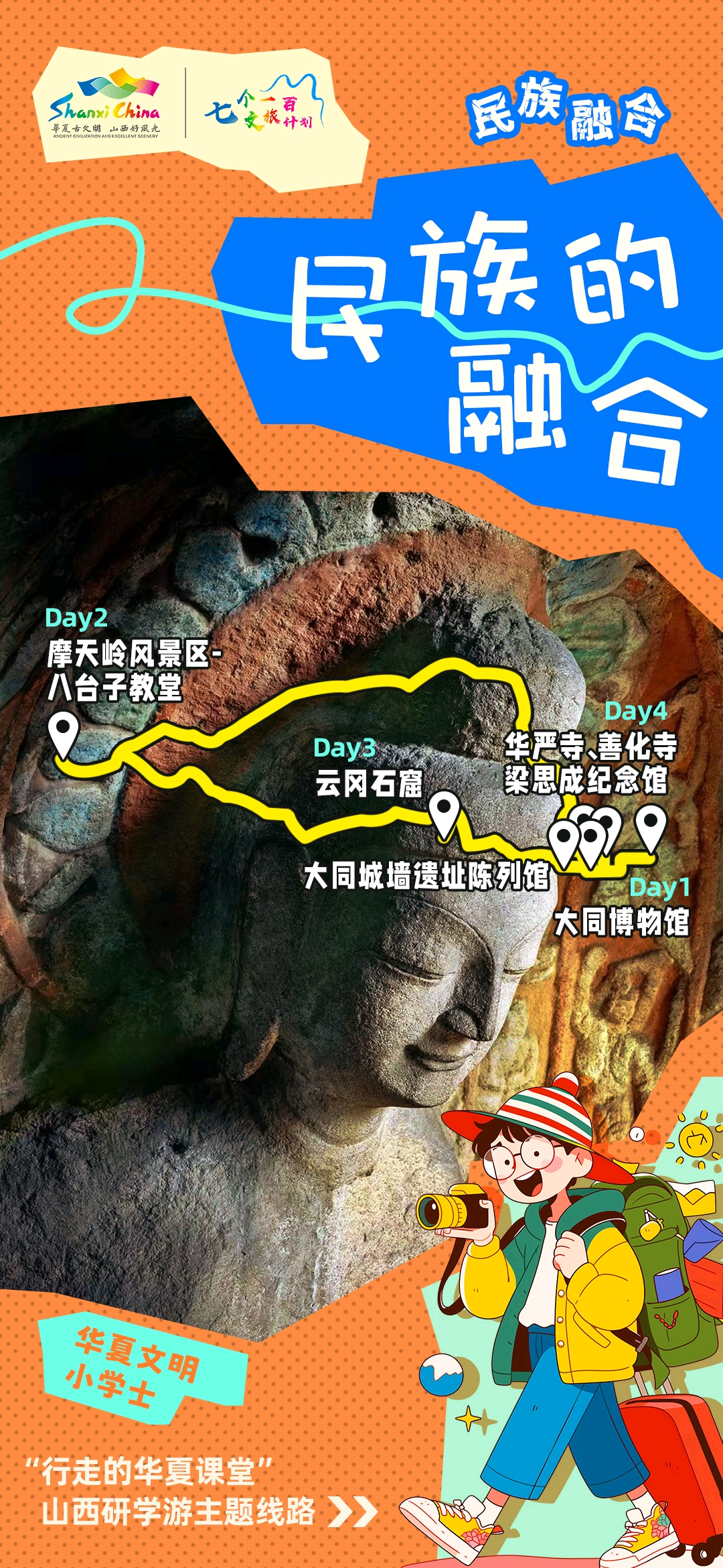 线路二“民族的融合”:大同——大同博物馆——大同城墙遗址陈列馆——云冈石窟——华严寺——善化寺——梁思成纪念馆