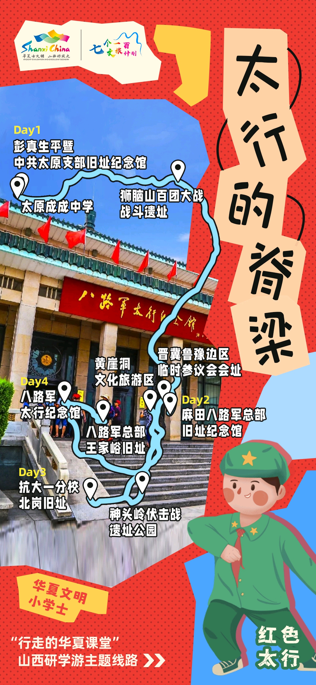 线路“太行的脊梁”:太原——太原成成中学——彭真生平暨中共太原支部旧址纪念馆——晋中左权麻田八路军总部旧址纪念馆——左权晋冀鲁豫边区临时参议会旧址——长治屯留区抗大一分校旧址——长治潞城区神头岭伏击战遗址公园——黎城黄崖洞革命纪念地——武乡八路军太行纪念馆——武乡王家峪八路军总部旧址景区