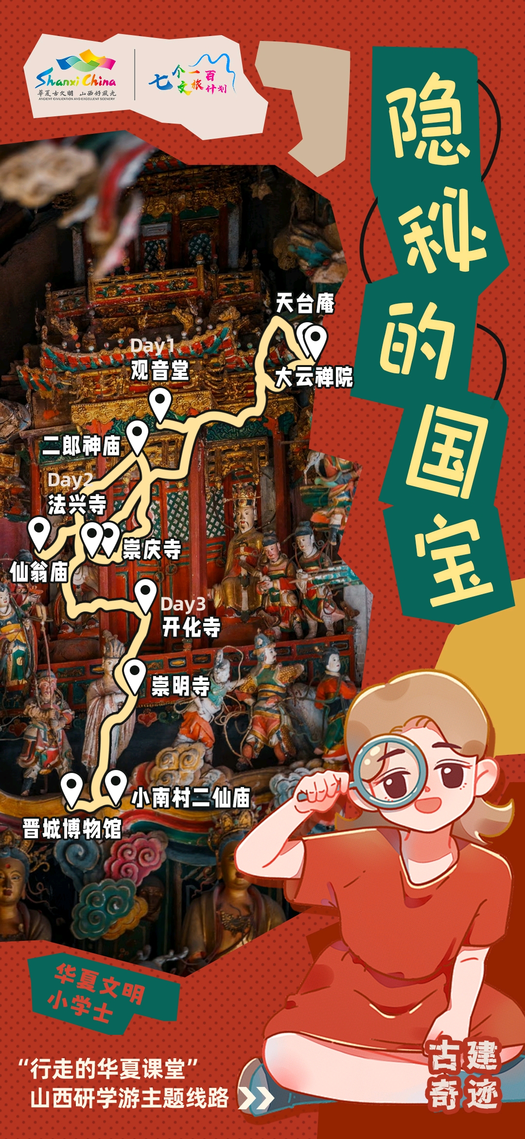 线路一“隐秘的国宝”:长治——观音堂——大云院——天台庵——法兴寺——崇庆寺——二郎庙——仙翁庙——开化古寺——崇明寺——小南村二仙庙——晋城博物馆