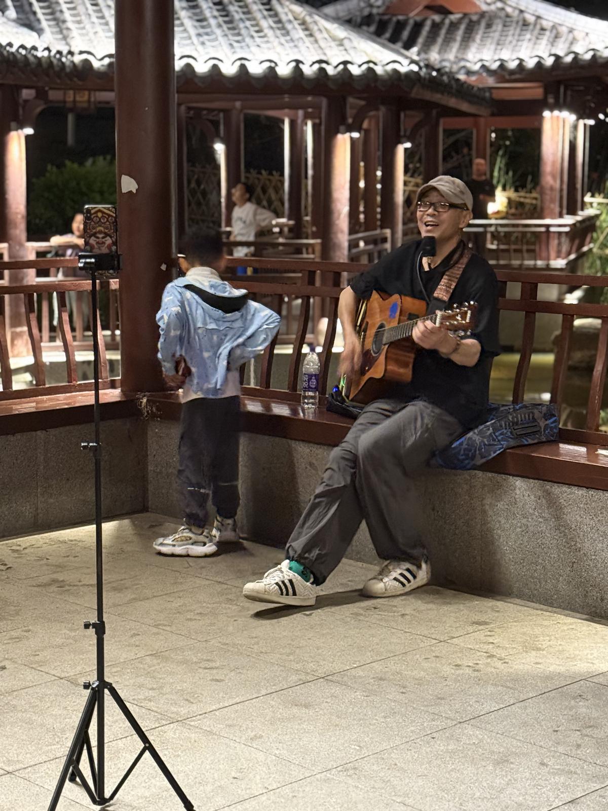 夜晚,游客在龙马湖公园的凉亭内直播。新华网 王梦佳摄