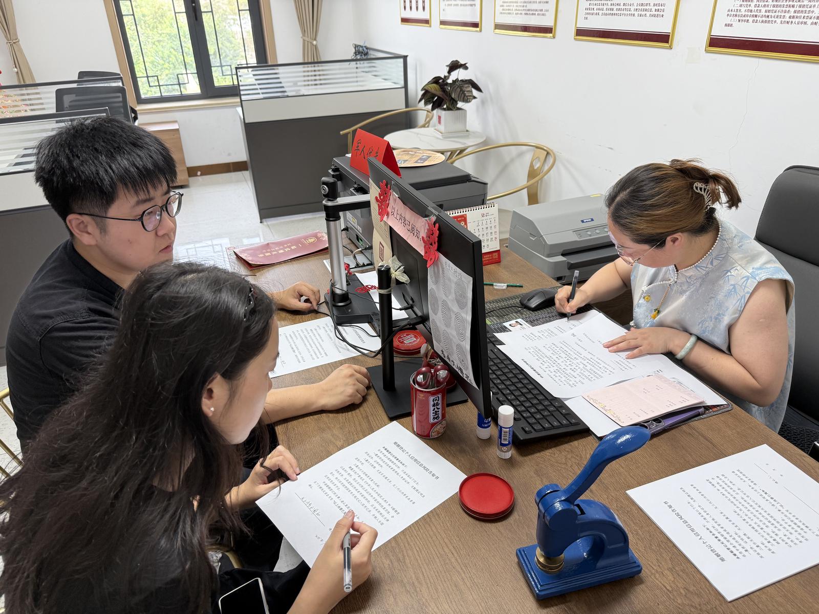 一对新人正在高平市民政局喜镇苏庄婚姻登记点办理结婚证。新华网 王梦佳摄