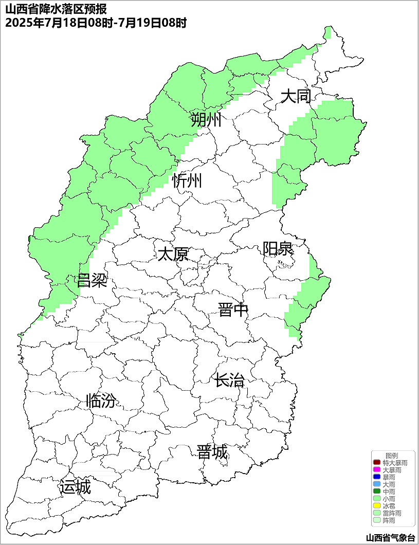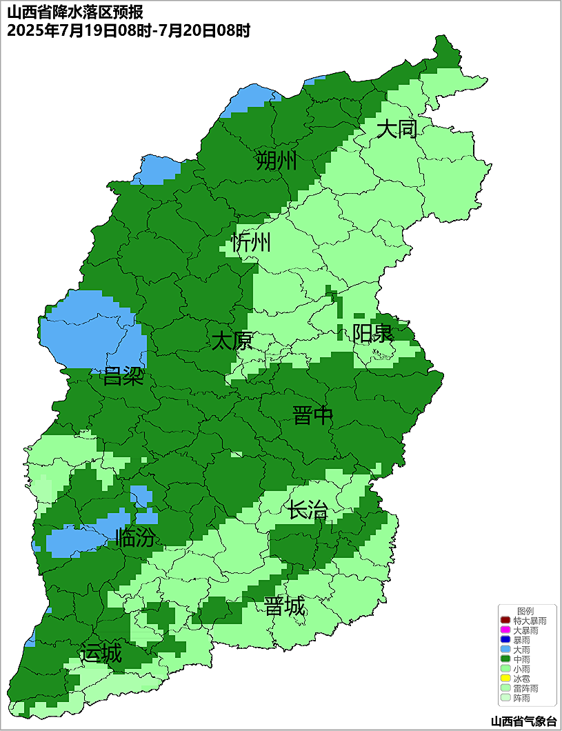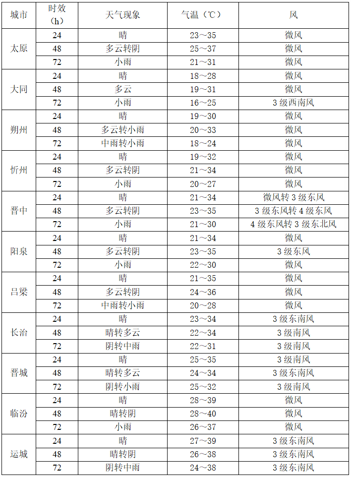后天白天到夜间:全省多云转阴天,有阵雨或雷阵雨,西部部分和东部局部地区有中雨,大同、朔州、忻州、吕梁、临汾、运城等地的局部地区有大到暴雨,并伴有短时强降水、雷暴大风等强对流天气;临运盆地部分地区有35℃或以上的高温天气、局部地区可达37℃或以上。