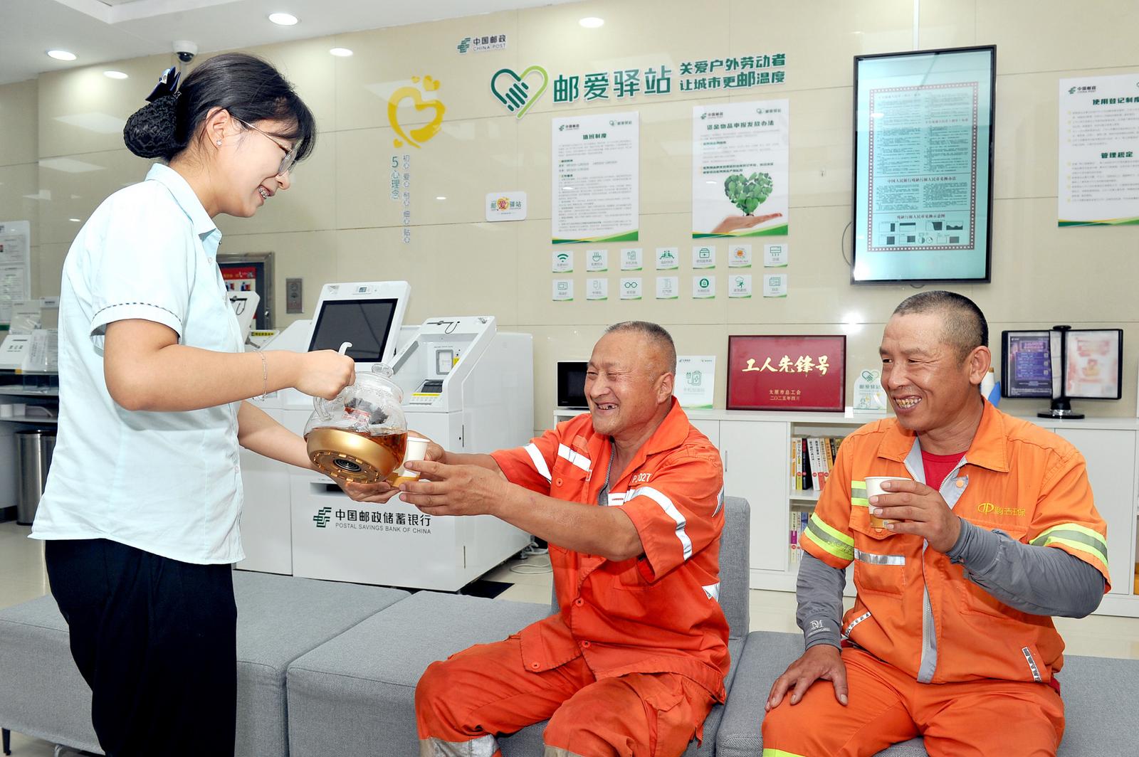 “喝点水、乘会凉,感谢邮爱驿站为高温下工作的我们提供了温馨的休息地方。”在太原邮政太行邮政支局营业厅内,环卫工人张强由衷感慨。